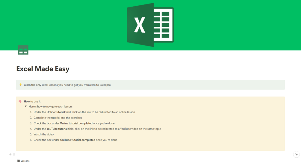 Excel Made Easy is a simple Notion template to help you learn Excel in just 30 days. Perfect for beginners or anyone wanting to improve their skills, this template has easy lessons and videos all in one place.