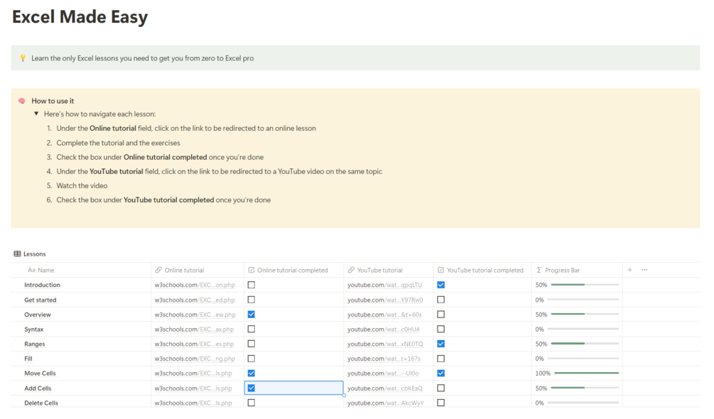 Learning Excel can be confusing with so many resources. Excel Made Easy makes it simple by putting everything you need in one place. Save time, stay motivated, and learn Excel easily with this Notion template.